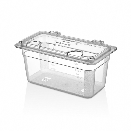 - Изготовлено из поликарбоната PC, пригодного для контакта с пищевыми продуктами, совместимо с гастрономическими поликарбонатными лотками.